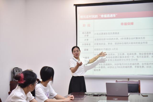 在新时代文明实践中心二楼会议室,思政部主任黄凤芝结合本次实践活动,以《学习贯彻党的二十届三中全会精神助力提高人民生活品质》为主题进行现场教学。她从党的二十届三中全会精神——突出“七个聚焦”,全面深化改革为切入点,结合学院师生暑期实践调研的塔元庄村现状、焕然一新的光明社区、党的十八大以来习近平总书记三次赴江西考察来诠释共产党人是如何让人民过上好日子,进而彰显让人民过上好日子是共产党人永恒不变的初心和使命。在现场教学中,黄主任勉励学生们不仅要学好专业知识,更要关注社会、关注民生、关注基层。要积极参加社会实践活动,了解国情省情民情,树立与时代主题同心同向的理想信念,敢于担当作为,将“小我”融入“大我”,以奋斗建功新时代、实现新作为,书写青春的精彩华章。