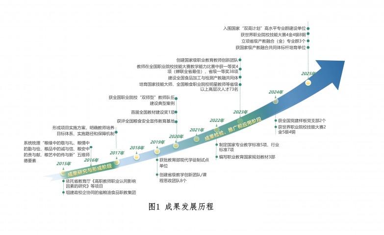 2015年,学校依托省教育厅《高职教师职业认同影响因素的研究》项目,联合中粮(江西)米业等行业龙头企业与科研院所,组建政校行企协同的省粮油食品职教集团,启动教师培养改革探索。项目组深入挖掘粮食文化育人内涵,系统梳理“粮缘中的敬与礼、粮情中的勤与俭、粮品中的诚与信、粮安中的责与献、粮艺中的传与新”五维师德要素,创新提出以“粮心铸魂”为核心、以“平台聚力”和“梯次成长”为双翼的“一核双翼”教师培养新理念。经过两年研究与实践,2017年形成《粮心铸魂·平台聚力·梯次成长——行业高职院校教师团队培养体系改革方案》,明确了教师培养的目标体系、实施路径和保障机制,成果进入实践检验阶段。