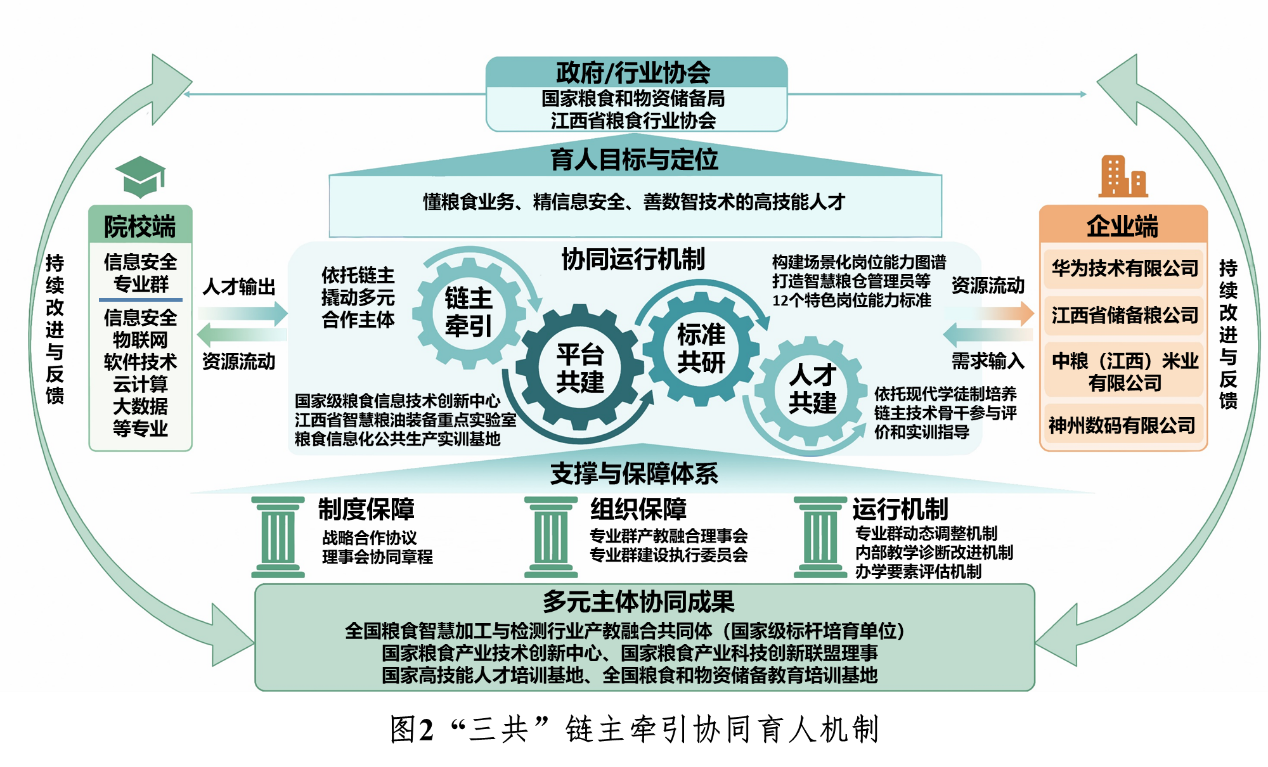 依托职教集团及升级的产教融合共同体,完善“链主企业牵头-理事会统筹-专业建设委员会执行”议事制度,构建“三共”链主牵引育人机制。平台共建:依托链主企业撬动国粮局、粮食行业协会、35家生态企业等多元主体,共同打造国家散粮技术创新中心和全省智能化重点实验室,共建省级智慧粮食加工生产性实训基地;标准共研:联合华为和省储粮等链主企业牵头剖析粮食行业信息化岗位群,绘制包含120项核心技能的场景化岗位能力图谱,共同研制智慧粮仓管理员等12个岗位能力标准;人才共育:深化国家现代学徒制试点,联合链主企业开设“华为卓越班”定向培养,链主企业技术骨干承担30%以上专业课程教学,全程参与教学评价与实习指导。