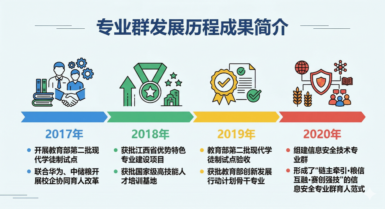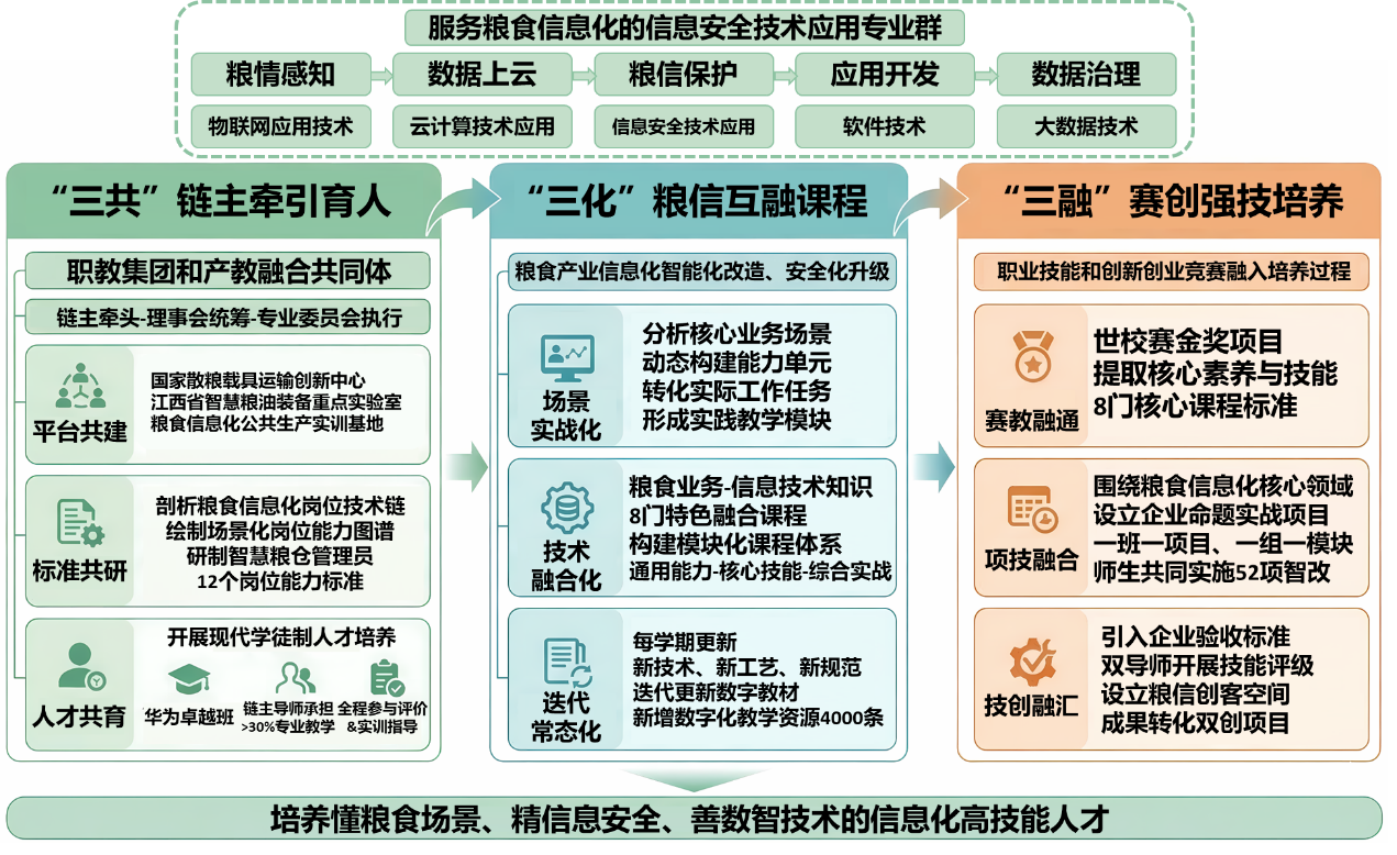 习近平总书记强调“粮食安全是国之大者”,在国家“藏粮于技”战略深入推进背景下,粮食仓储、加工、溯源等关键环节加速数智化转型升级,懂粮食场景、精信息安全、善数智技术的信息化高技能人才缺口成为制约粮食安全的关键瓶颈。作为省内唯一涉粮高职院校,江西工业贸易职业技术学院自2017年起,锚定粮食信息安全人才短缺痛点,紧扣粮食产业数智化转型的岗位链条,以信息安全技术应用专业为核心,融汇物联网、云计算、软件技术、大数据专业组群,依托国家现代学徒制试点和省优势特色专业建设,基于协同理论与国家粮食安全战略需求,遵循“强粮育才、群链嵌合、场景淬炼”专业群育人新理念,联合华为和省储粮等链主企业,针对“链主企业牵引作用不强、互融教学资源建设滞后、学生实战创新能力不足”等教学问题,创新构建“链主牵引·粮信互融·赛创强技”的信息安全专业群育人范式,从产教协同、课程建设、实战培育三维发力推进改革,2020年形成全国首个粮食信息化安全专业群育人改革方案。