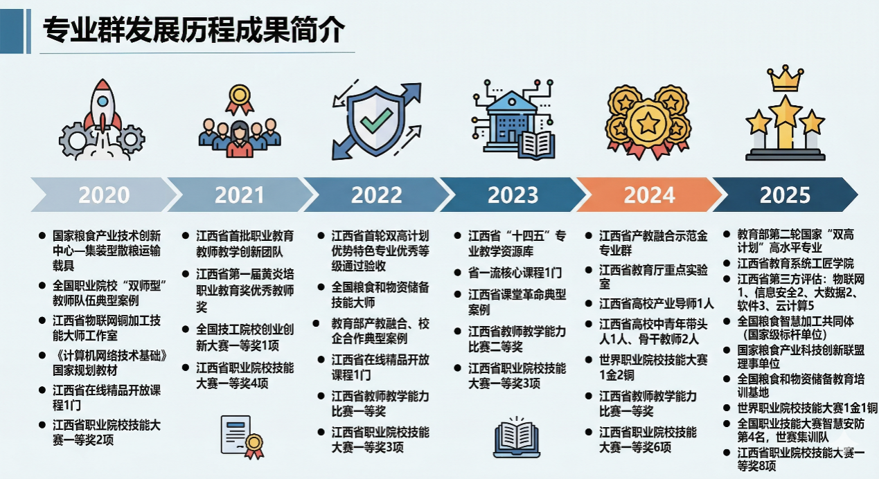 成果累计培养粮食信息化高技能人才近万人,专业群招生规模持续扩大,毕业生就业率达95%以上;学生连续两年蝉联世界职业院校技能大赛金奖(全省唯一),斩获国家级技创竞赛奖26项,先后入选教育部国家“双高计划”高水平专业、国家骨干专业、第二批现代学徒制专业,专业建设层级稳居全国高职第一梯队。建成国家高技能人才培训基地、全国粮食和物资储备教育培训基地2大国家级人才培育平台;获批国家粮食产业技术创新中心、国家粮食产业科技创新联盟理事单位,牵头建设全国粮食智慧加工与检测行业产教融合共同体,获评国家级标杆培育单位,产教融合载体层级高、覆盖面广。获批入选国家职业教育教师教学创新团队,全国职业院校“双师型”教师队伍建设典型案例(全省仅2例);建成全国粮食和物资储备技能大师工作室,获评国家级技能大师1名;编写《组网技术实用教程》国家级规划教材。省委主要领导、国粮局主要领导等14位省部级领导先后莅临调研,对专业群育人成效给予高度肯定。央视《东方时空》《中国教育报》等主流媒体专题报道办学成果50余次,吸引省内外37所兄弟院校专程前来交流学习。