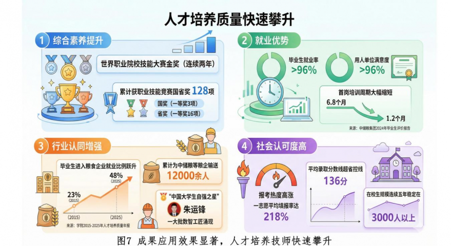 综合素养提升,学生连续两年斩获世界职业院校技能大赛金奖,累计获职业技能竞赛国奖(一等奖3项)、省奖(一等奖16项)128项,全省第一。毕业生就业率及用人单位满意度均超96%,首岗培训周期从6.8个月缩短至1.2个月,深受中储粮、南粮等粮企高度认可。行业认同增强,毕业生进入粮食企业就业比例从23%跃升至48%,累计为中储粮等粮企输送12000余人,涌现出“中国大学生自强之星”朱运锋等一大批数智工匠。社会认可度高,近年来IT类专业报考热度高涨,一志愿平均填报率达218%,平均录取分数线超省控线136分,在校生规模连续五年稳定在3000人以上。办学成果受到了省委书记、国粮局局长等20余位领导充分肯定。
