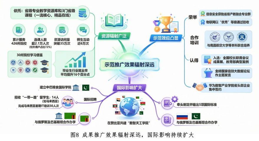 资源辐射广泛,依托省级专业教学资源库和3门省级课程(一流核心课程、精品在线开放课程),累计服务426所院校,选课人数超2.1万人次(校外用户占比72%),资源访问量突破35万次,师生互动近6万次。江西机电职业学院等30所省内外院校来校学习借鉴行业精准育人模式后,毕业生行业就业率平均提升16个百分点。示范效应凸显,信息安全专业群获批省级产教融合专业群,物联网应用技术专业以“优秀”等级通过省级特色专业验收,并与南昌航空大学等高校开展本科层次联合培养。办学成果入选全国高职高专校长联席会议成果展及教育部产教融合典型案例,在第一届金砖国家信创大数据人才培养高峰论坛作主题发言,华为数智产业学院入选省委、省政府头部企业集中签约项目。国际影响扩大,建立中巴粮食国际学院,招收马来西亚等“一带一路”国家留学生14人,完成30人次马来西亚学生暑期IT培训;牵头制定并输出5项国际标准,在赞比亚共建“数智天工学院”,与俄罗斯及巴基斯坦等国开展国际合作办学。